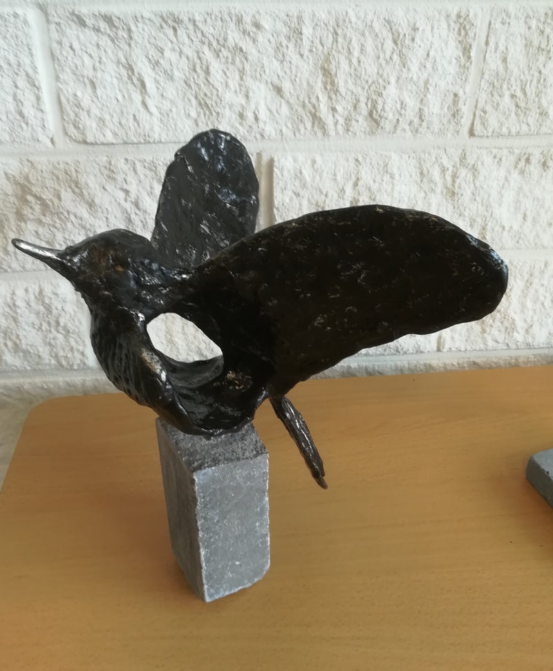 Met mijn zus ga ik naar een workshop, we maken elk een beeldje van een vogel. We krijgen als uitgangspunt een stenen voet met daarop een metalen ring. Mijn zus gebruikt de ring als standaard voor 3 kleine vogeltjes. Ik maak een grote vogel met de ring als basis. Het blijkt een hele klus, maar het is leuk om mee bezig te zijn. Aan het eind van de middag nemen we allebei tevreden het resultaat mee naar huis.